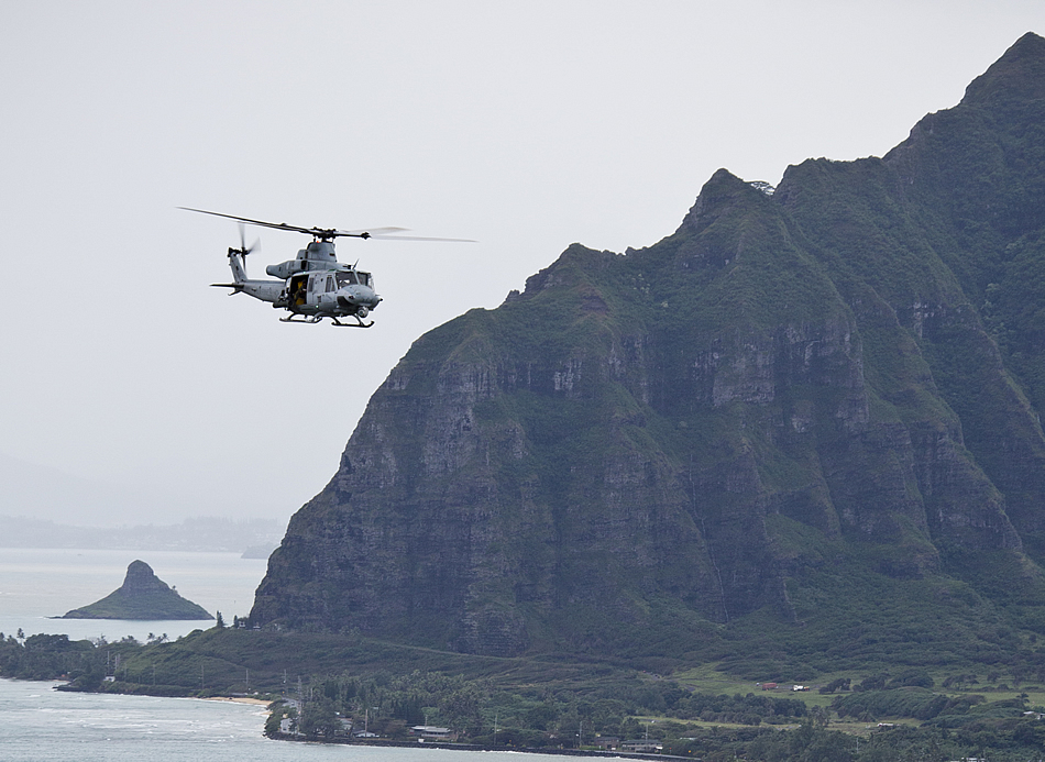 A UH-1Y Huey aircraft with Marine Light Attack Helicopter Squadron 367, flies over Hawaii, Nov. 20, 2015. The unit gave Commandant of the Marine Corps, Gen. Robert B. Neller, and Sgt. Maj. of the Marine Corps Ronald L. Green, a tour of the Oahu facilities during their Hawaii visit. (U.S. Marine Corps photo by Staff Sgt. Gabriela Garcia)