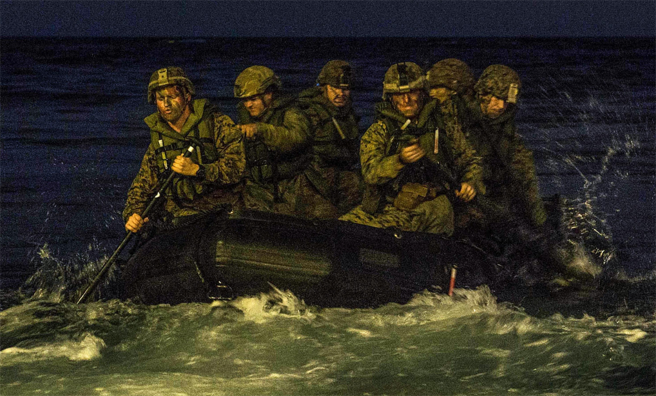 Marines depart the well deck of USS Green Bay in combat rubber raiding crafts at night to conduct a raid during an exercise in the Coral Sea, Aug. 15, 2017. The Green Bay is participating in the exercise to increase joint capability to respond to a number of potential contingencies. Navy photo by Petty Officer 3rd Class Sarah Myers