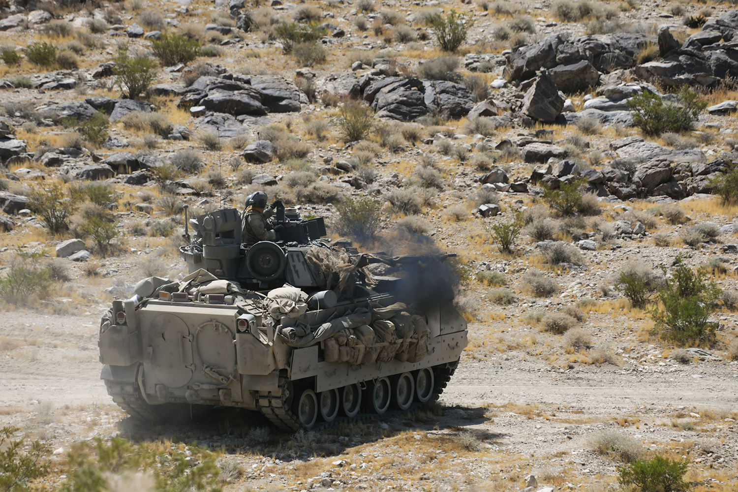 U.S. Soldiers assigned to the 5th Squadron, 7th Cavalry Regiment, 1st Armored Brigade Combat Team, 3rd Infantry Division maneuver a Bradley Fighting Vehicle during Rotation 24-09, at the National Training Center, Fort Irwin, Calif., July 20, 2024. (U.S. Army photo by Staff Sgt. Julie Jaeger, Operations Group, National Training Center)