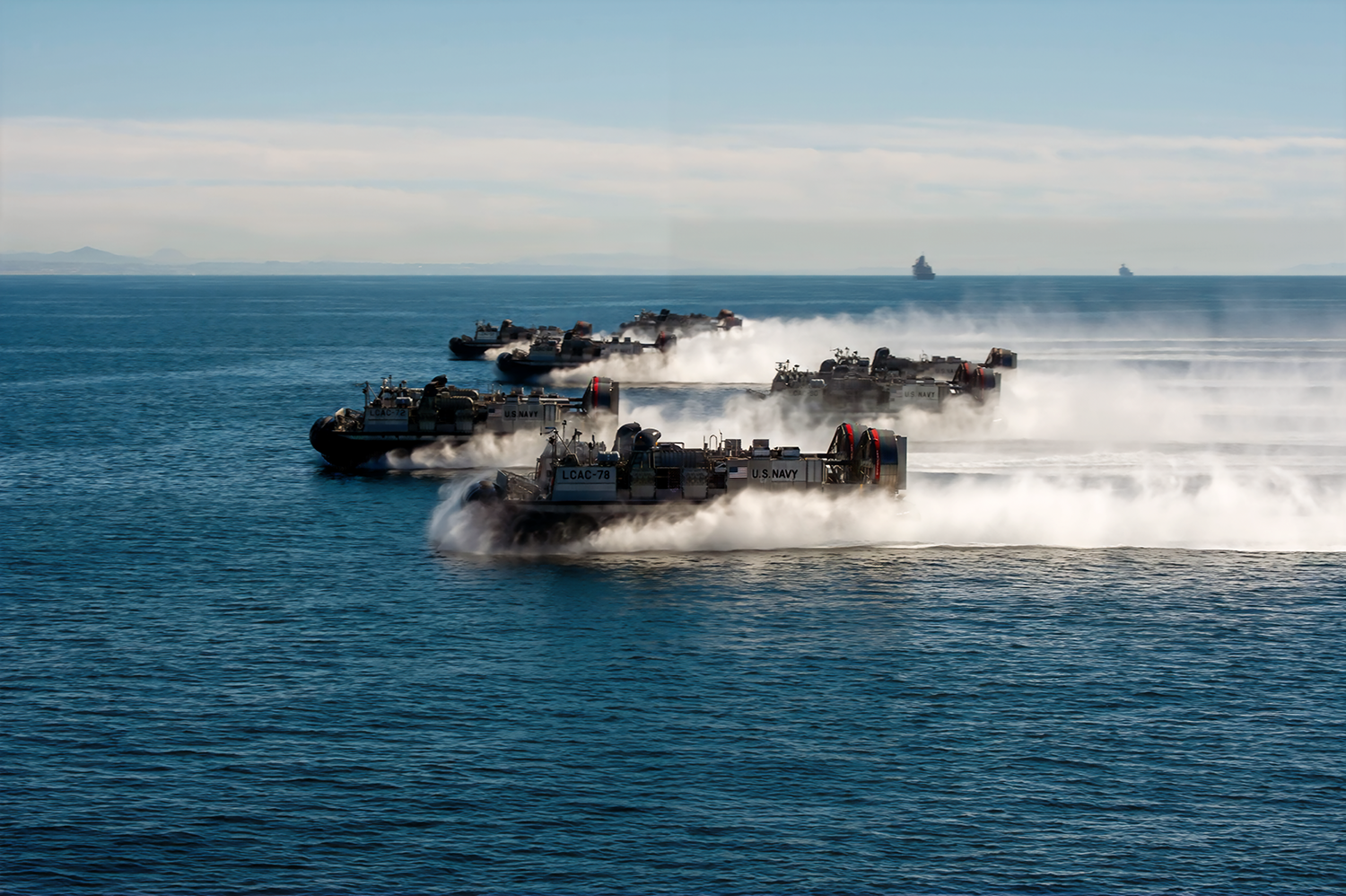 U.S. Navy landing craft, air cushion assigned to Assault Craft Unit 5 maneuver toward Marine Corps Base Camp Pendleton, Oct. 18, 2025. The 250th Amphibious Capabilities Demonstration at Camp Pendleton marks the Marine Corps’ 250th birthday and America’s Semiquincentennial. The live-fire event highlights the Navy-Marine Corps team’s ability to integrate across air, land, and sea, showcasing the Corps’ enduring role as America’s force in readiness. (U.S. Navy photo by Mass Communication Specialist 3rd Class Roland Ardon)