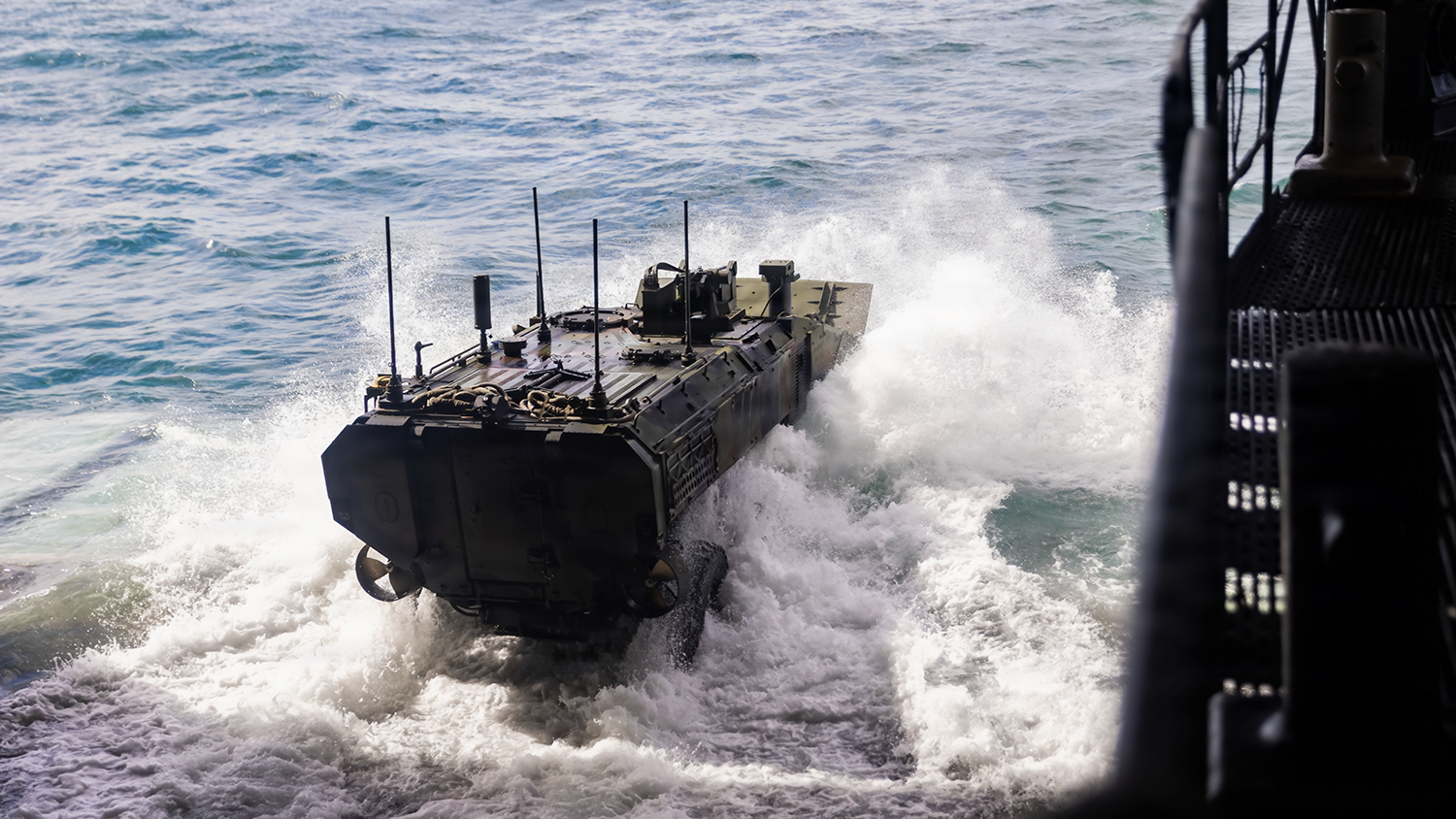 U.S. Marines with 2nd Assault Amphibian Battalion, 2nd Marine Division, launch during Naval Integration Training Package 1 aboard the Whidbey Island-class dock landing ship USS Gunston Hall (LSD 44), Oct. 24, 2025. NITP-1 is an amphibious, ship to shore, part of a larger training evolution certifying amphibious combat vehicle crewmen to safely and properly conduct combat operations with the ACV. (U.S. Marine Corps photo by Lance Cpl. Brian Bolin Jr.)